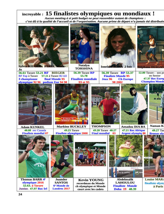 In 2011, the world record holder Kevin YOUNG was invited and, at the end of the meeting, announced to the press that he was coming back in 2012 to run, to celebrate the 20th anniversary of his world record and the 25th of TARARE.